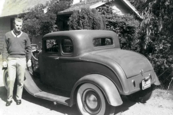 Roy has been crazy about cars even longer than he has been in the insurance business. His first personal car in high school in Gig Harbor, Washington, was a baby blue 1940 Plymouth. He can’t even remember all the cars he had when he was in high school and college. Here is a photo of Roy with one of his cars from when he was in his 20s. Isn’t he cute? He was working full time as a machinist for a tool and die maker while going to college. He was proud of his ’32 Ford five-window coupe, which was chopped and channeled.