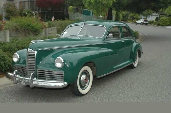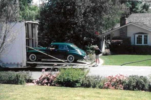 He was without an old car for a number of years, but that changed in 2005, when he acquired a 1941 Packard Clipper sedan. The history of our Packard is interesting. Its original owner was the rich widow of the owner of a coal mine in West Virginia. When she died, the car went to her niece, who drove it for a few years. There were a few short-term owners and it then ended up in a museum in West Virginia. The museum sold it to a private owner, who drove it home to Phoenix, Arizona. When he died, his wife sold it to Roy. Here is a picture of the exciting day when it arrived and was unloaded at our front door in February 2005.