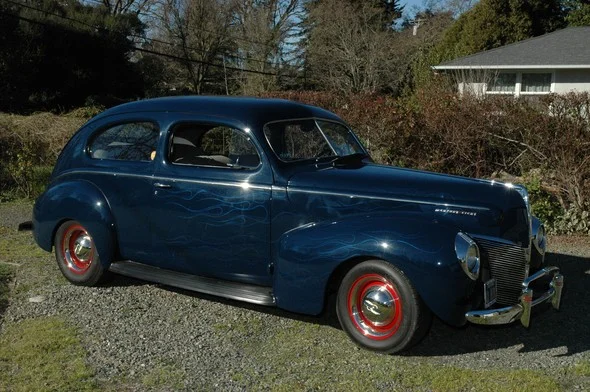 Then in 2006 he acquired a rather rare 1940 Mercury Tudor. (That’s not a period in English history, but Ford’s name for two-door.) We also know this car’s history. It was originally purchased by a man in South Dakota in December 1939. It was only the second year the Mercury was in production, and it was an impressive car to own in his small town. He went to war and put it up on blocks in the barn before he left. Like many other young men, he didn’t come home. In 1947 the neighbors talked the widow into selling them the car. They took excellent care of it and it was used as a backdrop on their Christmas cards. The wife said she never had to worry about the kids getting into trouble because when they drove the Merc, everybody in town knew the car and would report on them.